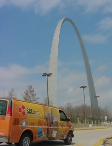Feeling pretty good about the excellent time we'd made the day before (I actually didn't expect us to hit Indianapolis until 2 hours later than we did), we got off to a bit of a late start. We did a quick drive through Casey, searching for that elusive non-chain restaurant at which to have breakfast, but found nothing of interest, except this old Mobil sign on Historic Rte 66. Knowing the people who may be perusing this, I'm fully aware that you all probably don't find this sign as cool as I do. I love old logos and such and like to capture them on film when I see them. So just get over it. We got back on I-70 and finally found a place to eat a few stops west. It was good, not particularly outstanding -- but it WAS only breakfast, after all. West to St. Louis we went, listening to "Deeptracks" on the XM Satellite Radio. While we've made a point of checking out different stations (we've even sampled moments of the Mandarin Chinese and Hindi stations, just because we can), "Deeptracks" seems to be one that we both can listen to for long periods of time. The format is similar to what old FM used to be like, back when it was cutting edge...where they just played tracks off of albums, whether they were hit singles or not (anyone under 30 probably has no clue what I am talking about here). The only bad thing about this particular station is that one never hears anything newer than perhaps from the 80's. One does hear some pretty cool stuff though. When we crossed the Mighty Mississippi, we ventured down to the riverbank to try to get a photo of the van at the Gateway arch. I'm pretty pleased with how it turned out. As I'd already been to the top of the Arch before, and my sister is way too claustrophobic to do it (you have to go up in a tiny capsule-sized elevator), we opted to just view the structure's magnificence against the clearing sky. In trying to get the van in a good spot for a picture, we had to get right on the shore of the river, which also offered a perfect opportunity of snapping a shot of the van near an old-fashioned riverboat. However, getting the van out of this area was a little tougher than I originally thought, and it required my pulling the front of the van so close to the river that it was nearly kissing the water. If I didn't have this horrendous fear that a few key bricks on the bank would slip, sending the van (and me) into the Big Muddy, I would have moved it even closer, had my sister snap a shot of the van and e-mailed it to Saldi with the subject line of "Small problem" -- the message stating, "Made a mistake in St. Louis - am now in transit to New Orleans. Might have to miss NPF. Please send help before I am dumped into the Gulf." From there we navigated the traffic surrounding Busch Stadium (the Cards were in town) and headed out to the American Kennel Club's Dog Museum. I know, some of you probably think a Dog Museum is really lame, but my sister and I both adore dogs, so shut up already. We spent some time there, and with the temperature now warm enough to require the air conditioning in the van, it seemed like the right time to partake of some fine frozen custard (y'know, the ice cream that comes out in swirls out of a machine). We backtracked a bit to make our way to Ted Drewes (thanks to the GPS we were able to find it -- it was even pre-marked on MapPoint). It was difficult navigating this suburban part of St. Louis, what with all the one-way streets surrounding our destination, but we finally got there and it was well worth the trouble. Sundaes are served in big ol' plastic tubs, the place is tremendously busy, and the custard outstanding. Supposedly the fondness for Ted Drewes' icy treat is so widespread that they actually do mail-order via overnight air! On navigating our way out and back towards I-44, of all places in the world we happened to pass, we passed none other than the Catholic Supply of St. Louis, home of the "Sporting Jesus" statues! For those of you who don't know about these statues, they're supposed to be inspirational statues for children who play sports. The funny thing about them (to myself and my co-worker Phil, anyway), is that Jesus is not guiding or coaching the children (like this "Baseball Jesus" statue) -- he's competing ("Football Jesus", "Hockey Jesus"), or just plain schooling them ("Basketball Jesus")! I know I'm probably going to hell for finding this funny (and for being such a bad Catholic), but I can't help it. Anyway, I simply had to take the picture for posterity. West/southwest we went through Missouri until the Robitussin kicked in and started to knock me out. Seems I'm developing either a wicked head cold or a brutal allergy (I'm thinking the latter over the former). I'd felt pretty crappy all day with wicked sinus pressure and I hadn't slept too well the night before. Thinking Robitussin Allergy/Cough would solve the problem, we purchased a bottle at a Target near Ted Drewes and I took a dose. It wasn't long before my eyes were beginning to roll in to the back of my head. Not wanting to kill either of us, I turned off at the first decent-looking exit and once checked in I hit the bed. (For those of you who may be wondering, I'm doing all the driving. My sister wants no part of driving the van!) I think even with this slight glitch we should be okay with time and still get to see the things we want to on the upcoming legs. As for dinner, it wasn't easy in to find something not a chain in rural southern Missouri near the Interstate, but where there's a will, there's a way. At one exit back, there was a steakhouse called "The Feed Lot Steakhouse and Saloon". The decor was Stuffed Animal. Literally -- there were full-sized stuffed lions, mountain goats, wolves, you name it -- mounted all over the place. Of course there were also the obligatory buffalo and deer heads mounted on the wall. I certainly didn't let any of that ruin my appetite, as I dined on highly tasty homemade cream of broccoli soup and fine midwestern me