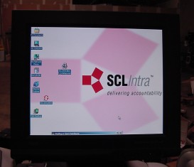 The Control Center - on the left, the small display controls the XM, behind the laptop in the dash is the AM/FM/CD, just behind the laptop display is one of the cell phones, and finally, the laptop displaying directions. The GPS receiver is on the dash and can't be seen in this photo. |